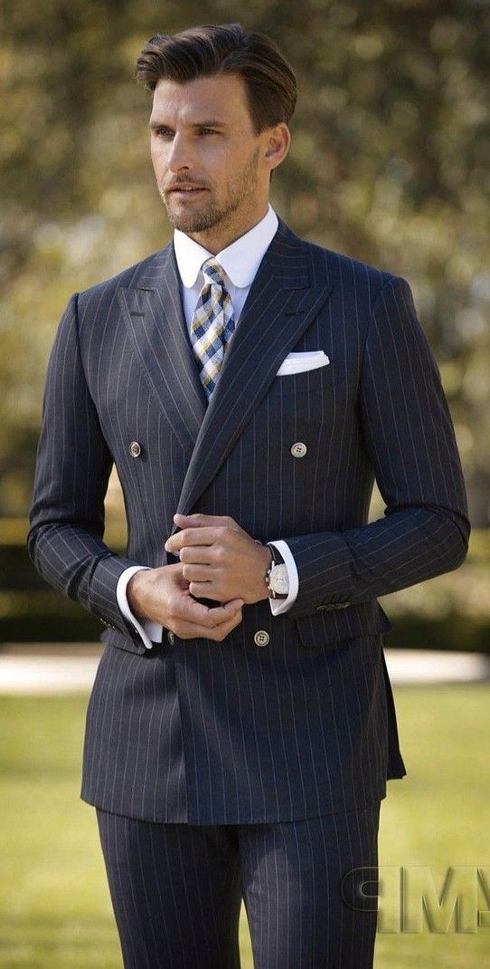 A sharp double-breasted navy pinstripe suit with structured shoulders, perfect white shirt, and patterned tie. Ideal for formal occasions, exuding confidence and classic masculinity.