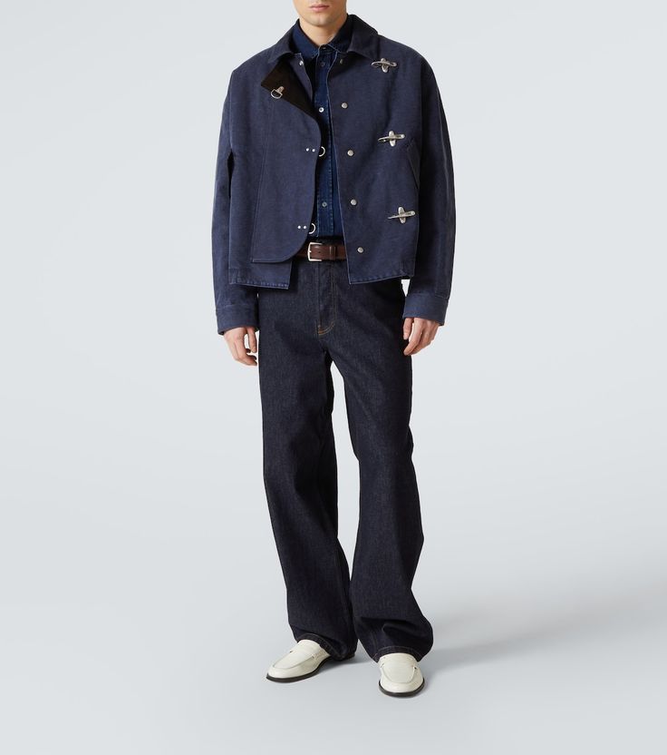 A premium navy blue cotton twill jacket with distinctive metal hardware, toggle buttons, and a structured fit. Designed for modern casual wear, perfect layered over shirts and denim for an elevated everyday look.