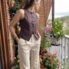 A sophisticated sleeveless beige vest with button details and tailored fit, complemented by relaxed black wide-leg pants. Effortless office-to-evening style with modern tailoring.
