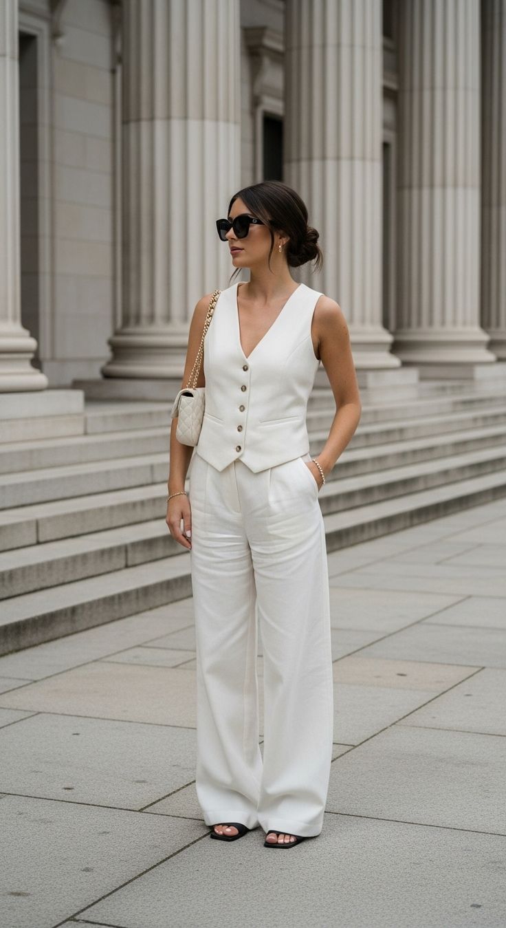 This all-white ensemble showcases a sleek V-neck sleeveless vest with button accents and flowing wide-leg pants. The epitome of quiet luxury and effortless sophistication for professional or casual settings